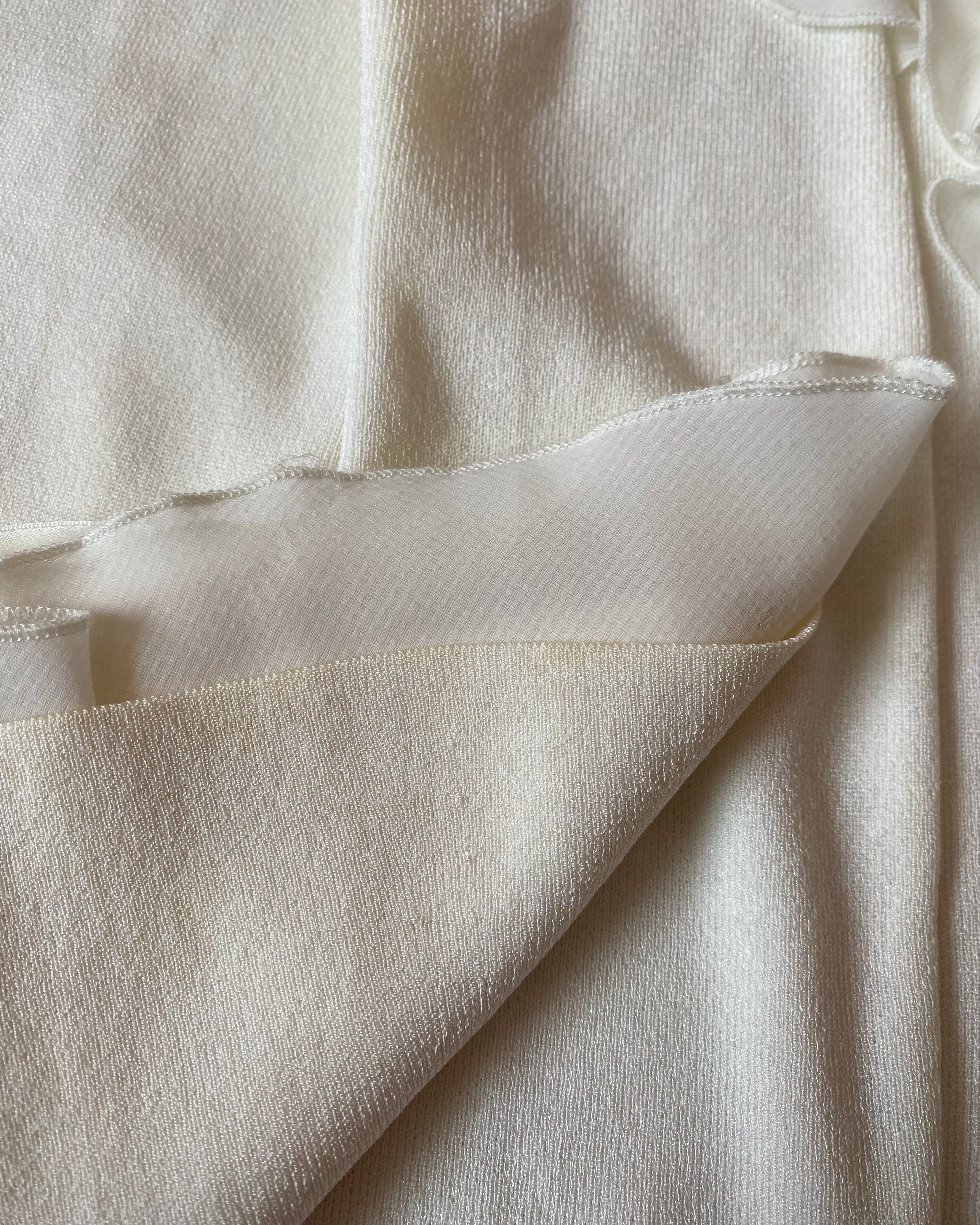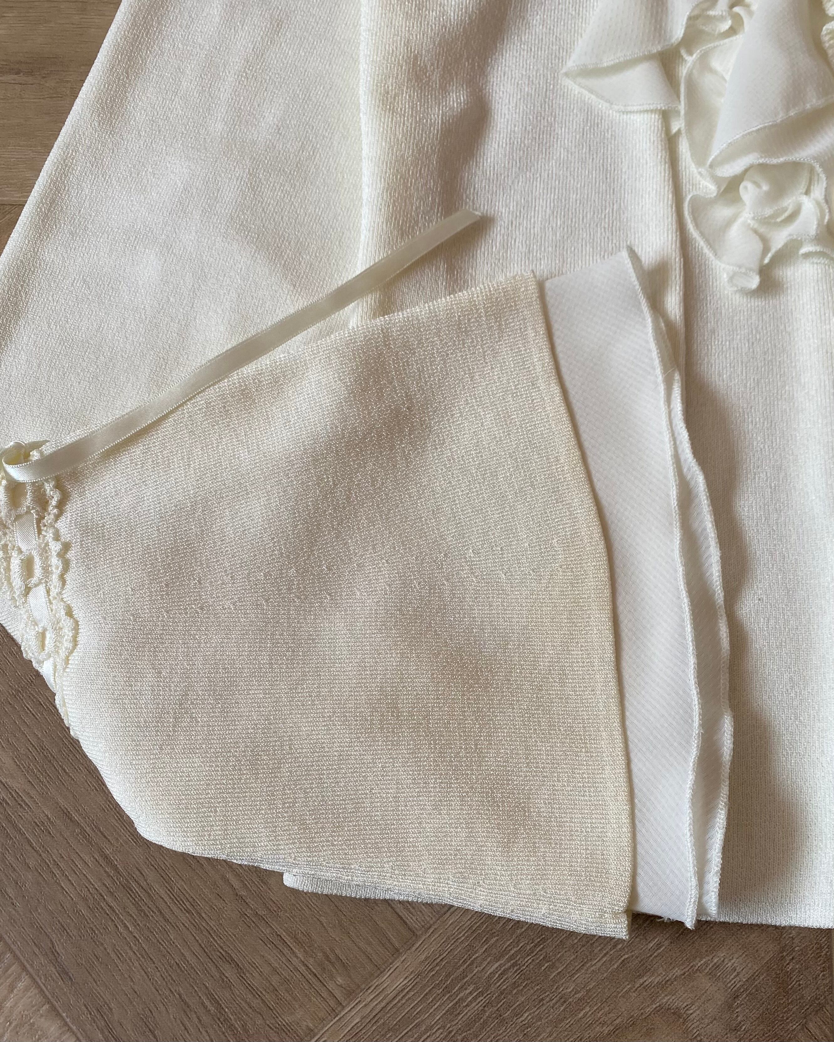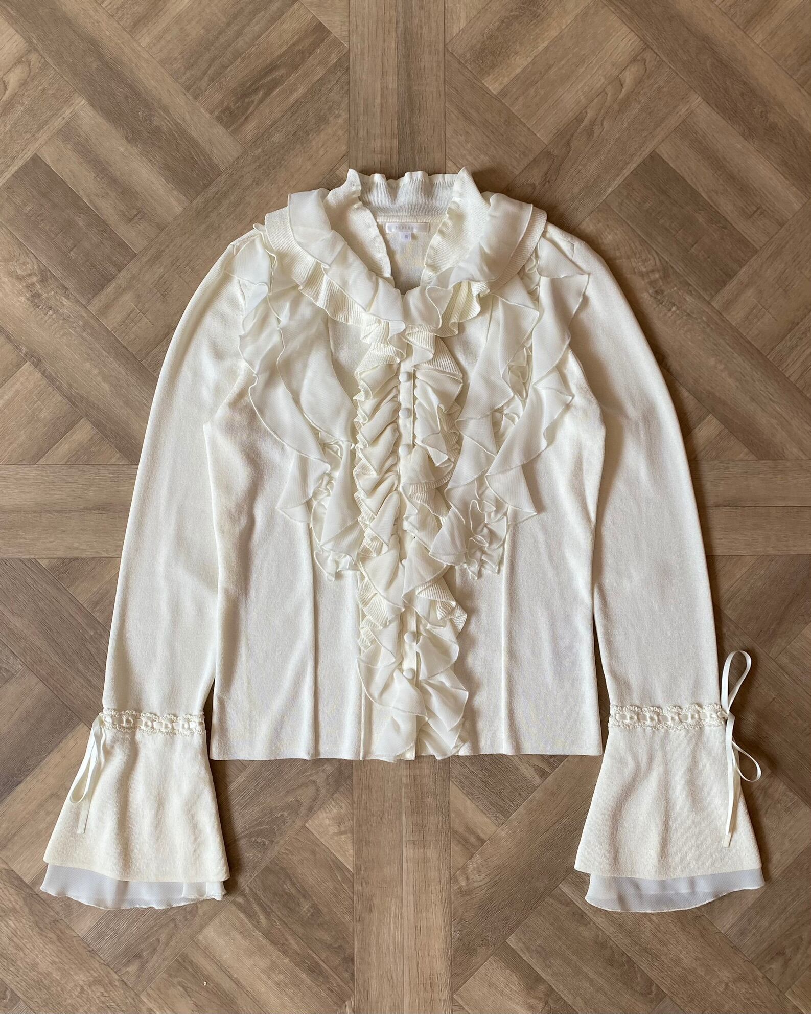 フリル部分はポリエステル、見頃や袖のパーツがニット素材なので快適です。袖に少し変色が見られますが、他は綺麗です。